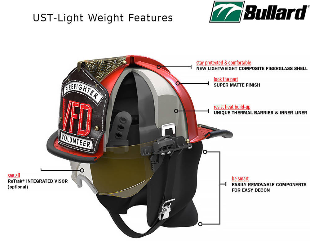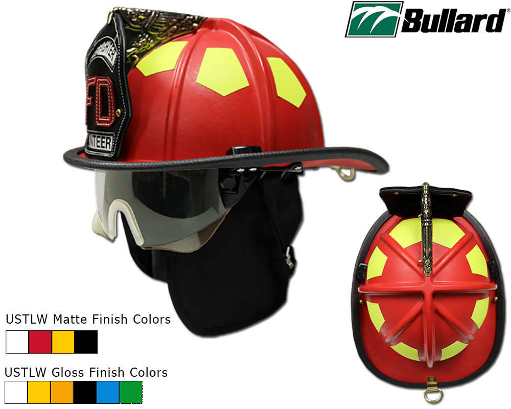 MODEL: Bullard UST-LWBullard’s latest traditional helmet features a new fiberglass composite shell that reduces weight by up to 10 ounces without compromising protection, making it one of the lightest on the market at just 3.4 lbs. It offers the same trusted strength and performance, with finish options in gloss or super matte and available colors including black, red, white, and yellow. Designed for superior comfort, the helmet includes Bullard’s proprietary U-Fit headband system with 36 adjustment settings—the most in the industry—to ensure a secure fit for a wide range of head sizes. Built for high-impact and high-heat environments, it features a molded nylon inner liner with a polyurethane foam thermal barrier that protects against internal heat rise. The helmet meets and exceeds NFPA 1971 standards for structural and proximity firefighting.